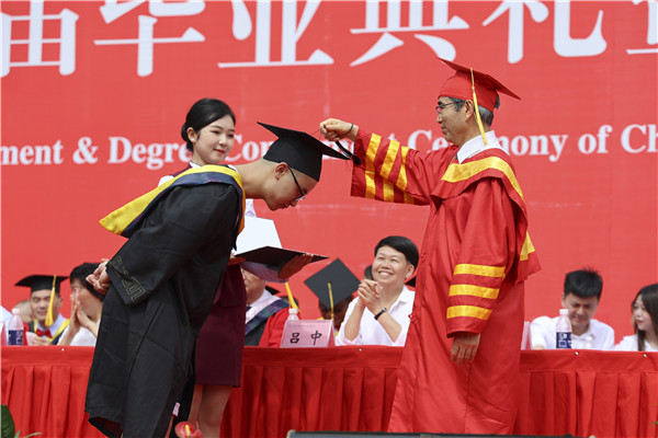 学校校长、学校学位评定委员会主席张国林教授为本科毕业生代表授予学士学位,拨穗正冠。