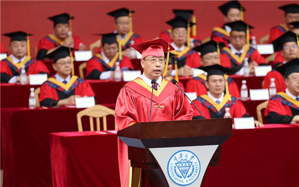 “启兹天府,积健为雄”同样出自我们的校歌。“积”意味着集聚和积淀,“健”代表着才能与力量。想要跨越理想与现实的沟壑,就要善于“积健”,做到博观而约取、厚积而薄发。九十余载,一代代重大人正是始终保持这样一种奋进姿态,为经济发展、社会进步和人类福祉,贡献着重大智慧和重大力量。我们的老校长周绪红院士,秉持“做好今天的每一件小事,就会成为明天的大事”这一信念,三十多年默默耕耘在结构工程领域,日积月累,助力万丈高楼平地起,打破了高层建筑修建技术的国外垄断地位,荣获国家科技进步一等奖。你们的学长,现场出席今天毕业典礼的李克强院士,同样通过数十年的探索与坚持,从技术体系革新到开放道路示范,再到产业化落地应用,向世界贡献了智能网联汽车发展的“中国方案”。欲流之远者,必浚其泉源。唯有本领过硬,才能底气十足。希望大家稽古振今,海纳百川,久久为功,磨砺真才实学,敢于突破跨越,增强勇做开路先锋和事业闯将的底气,用青春的力量激荡民族复兴的澎湃春潮。