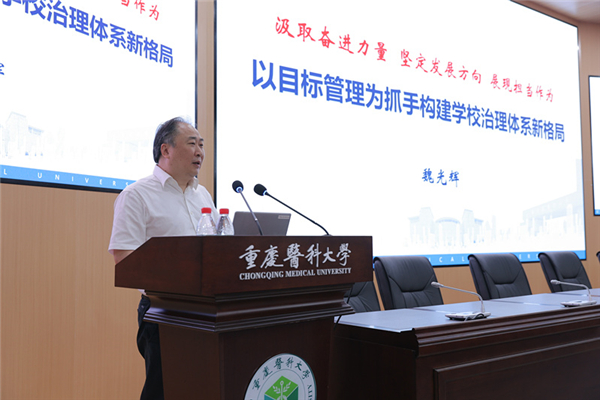 会上,校党委常委、副校长魏光辉作题为《汲取奋进力量、坚定发展方向、展现担当作为,以目标管理为抓手构建学校治理体系新格局》的专题报告,并代表学校目标考核领导小组就学校事业发展目标管理与考核工作做动员部署。他从学校实施目标考核的出发点、考核文件的编制过程、基本框架和下一步工作安排四方面系统介绍了目标管理与考核工作相关情况。魏光辉在报告中指出,前期经过发展规划处深度调研、在各部门积极配合下完成了考核办法的科学编制。目标考核要树立全校“一盘棋”思维,构建“大重医”一体化发展格局。学校与附属医院、职能部门与学院要形成“责任共同体”,职能部门要根据“十四五”规划中关键发展指标的设置情况,综合考量各学院所处发展阶段,科学合理分配年度目标;附属医院和学院要紧密围绕学校总目标,强化横向比较、纵向发展的思维,将五年规划分解到年度。通过职能部门与学院上下结合、达成共识,切实做到“一院一策”,提高考核的精准性和有效性。