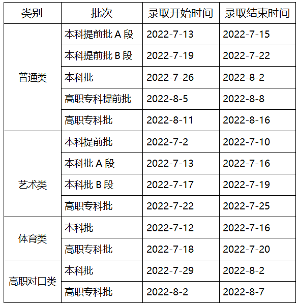 ■各类各批次录取时间我市2022年普通高校招生录取工作即将全面正式开始,将于8月16日结束,各类别各批次录取进程安排如下。