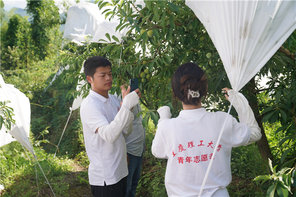 曜日当空,蝉声阵阵。竹园镇义和村的李子园基地,位于山顶的茂林从中。迎着太阳的炙烤,热浪一阵阵袭来。7月11日,进行果园现场直播带货的师生顶着烈日,在果园里来来回回穿梭。为防止直播中出现意外,直播小分队准备了2部手机作为直播媒介。烈日下,直播刚刚进行10多分钟,两部设备先后出现温度过高预警,不得不临时中断。