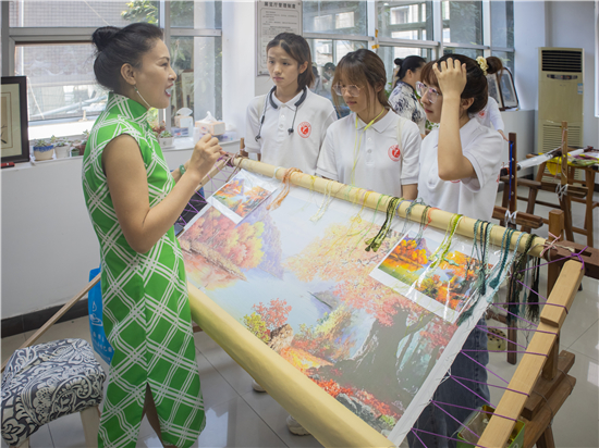 从传承人的口中,志愿者们了解到,鱼洞乱针绣又名“正则绣”,作为一种全新独立的刺绣种类,在巴南鱼洞已经传承了近百年。乱针绣可根据光影的变化和造型的需要自由变化,远看凹凸有致、层次鲜明,近看针脚繁密、层层交盛,令人耳目一新。随着它的声名鹊起,乱针绣被称为继传统四大名绣(苏绣、蜀绣、湘绣、粤绣)之外的第五大名绣。2011年,鱼洞乱针绣被纳入重庆市市级非物质文化遗产项目。