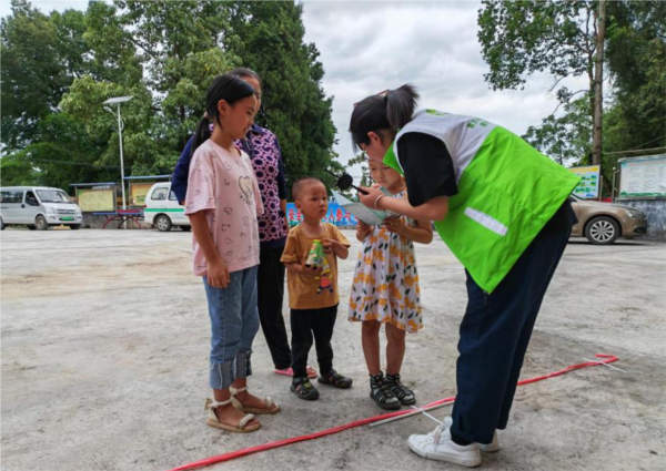 图2:“睛”彩护眼服务队为黔江区沙坝镇留守儿童检查视力
