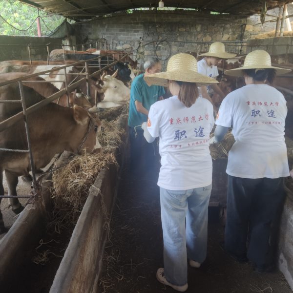 7月14日6:00,武隆分队迎着微明的天色,踏上前往养殖场的小路。驻村干部代伟提醒组员们要尽力克服养殖场的艰苦环境。为增强经济创收效益,大水村当地大力发展传统畜牧业,这家养殖场尽管配置简陋,但规模庞大,共蓄养西门塔尔牛五十余头,板角山羊二十余头,杜洛克猪十余头。两排围栏中间留出一条小道供喂养人行走,组员们帮助养殖场的管理员爷爷推来一车食料,并进行了喂食。实践团了解到,喂养人一天要喂两次牛,每次持续两个小时,需要付出许多的心血和汗水才能换来牛的茁壮成长。爷爷十分热情地向组员们介绍养殖场的情况,并主动带领组员参观养殖场的仓库,讲述他的日常工作,这极大地加深了组员对传统畜牧业的了解。
