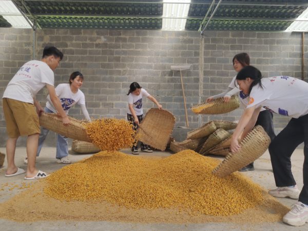 16:00,跟随着酒曲的香味,实践团来到了瓦屋酒厂进行酿酒劳动。酒厂老板一步一步教导,并耐心地回答组员们的各种问题,这是组员们第一次跳出课本知识,直接接触到真正的酿酒环节。成员小张感慨:“感受到酿酒不仅是一种体力劳动,需要搬运各种材料,更是一种充满劳动人民智慧结晶的产物。”酿酒的过程十分漫长,从高温蒸煮原材料到至少七天的酒曲发酵,再到最后的高温蒸馏出酒,这个过程不但是酒的酿造,更是人的心境磨砺,时间最终会给予劳作者珍宝。