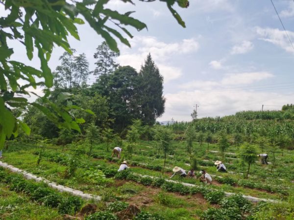 9:30,组员们来到西瓜地进行除草、顺藤、浇水等劳动。这片西瓜地栽种的品种正是远近闻名的沧沟西瓜,特殊的地形及适宜的气候环境造就了这一张武隆特色产业名片。代伟指导组员们分辨瓜藤和杂草,如何使用镰刀。通过亲身劳动体验,组员们了解到传统种植业需要付出大量的精力和心血,充满着风险性、不确定性、低效益性。