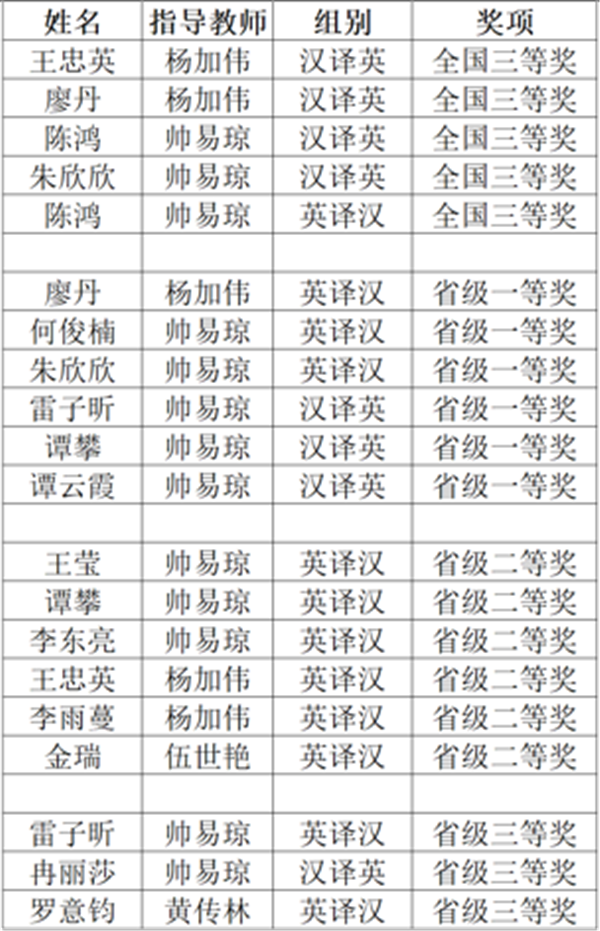 为贯彻落实教育部《关于加快建设高水平本科教育全面提高人才培养能力的意见》等文件精神,激发大学生英语学习的兴趣,促进大学生英语翻译能力发展,为全国在校大学生提供展示英语翻译水平和能力运用的舞台,商务印书馆直属《英语世界》杂志社于今年3-8月举办了2022年全国大学生英语翻译能力竞赛。重庆移通学院外国语学院教师积极响应,动员并组织学生报名参赛。最终重庆移通学院5人次获全国三等奖,6人次获省级一等奖,6人次获省级二等奖,3人次获省级三等奖。