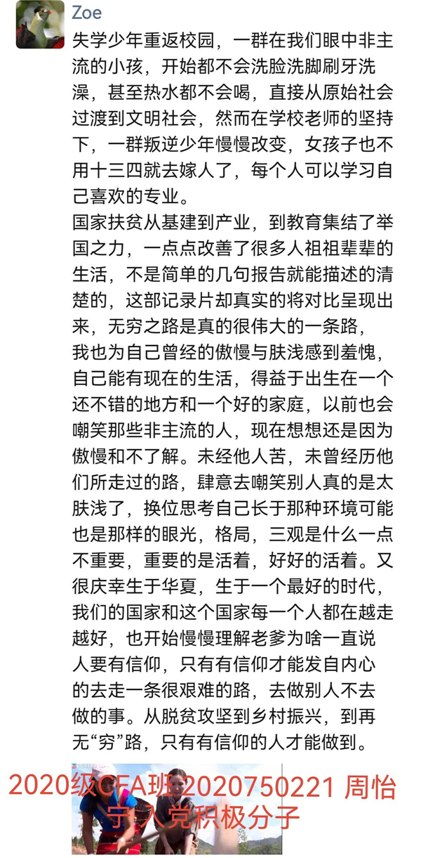汲取脱贫之智,讲好中国故事。通过开展“汲取脱贫之智,讲好中国故事”党性教育活动,让学生党员和入党积极分子们跟随着《无穷之路》的主持人穿越崇山峻岭、戈壁沙漠,了解了一个个鲜活的人物与饱含真情的故事,感受着这片土地因为扶贫政策所产生的翻天覆地的变化,体会到国家的“精准扶贫,科学扶贫”政策真正内涵。参与本次活动的学生党员、入党积极分子共190名,共收集微信朋友圈感想截图358份。