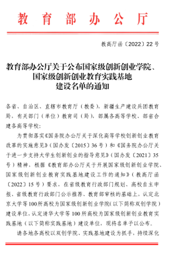 为全面贯彻落实《国务院办公厅关于深化高等学校创新创业教育改革的实施意见》和《国务院办公厅关于进一步支持大学生创新创业的指导意见》文件精神,教育部2022年首次面向全国高校建设100个国家级创新创业学院。重庆文理学院高度重视申报工作,创新创业学院将申报国家级创新创业学院纳入2022年工作重点事项予以推进。在学校党委、行政坚强领导下,分管校领导亲自部署此项申报工作,创新创业学院具体牵头,认真总结学校创新创业教育改革典型经验与做法,凝炼创新创业人才培养特色,精心撰写申报材料,以优异成绩通过重庆市组织的专家评审,成功入选市级和国家级创新创业学院建设单位。