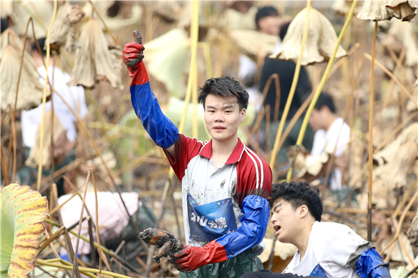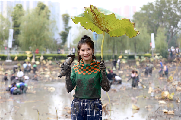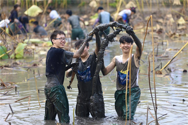 10月22日上午9:30,重庆移通学院“荷叶田田·藕趣横生”第四届书院“家”校园荷塘文化节之“藕然心动”采藕大赛再度回归,19支队伍气势昂扬、整装待发,共同奔赴这场“藕然之约”。活动现场,两百余名师生撸起袖子、穿上水裤、淌入泥塘、寻根采藕,有的不骄不躁、团队协作,有的玩趣大发、泥里撒欢,有的双手翻飞、干脆利索,在秋日荷塘里上演了一场速度与技术兼备的“藕王”争霸赛。最终,师生并肩作战,徒手采挖莲藕1725斤!鱼城书院代表队挖出的莲藕一根三支,完整保留了莲藕、藕带、荷叶三种形态,身长125cm、净重8.8斤,喜提“年度藕王”称号。