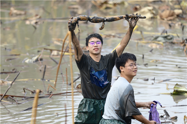 2019级大数据与计算机科学学院学生邓胜婷作为本次活动的组织者之一,对于本次活动的顺利举办感受颇深:“2019年初识荷塘文化节是兴趣使然,做荷花灯、布展,希望每位参与者能从一花一叶中感受到我们的热情与欣喜。2020年疫情袭来,满池荒芜不仅让关注荷塘文化节的众多师生们感到可惜,我作为组织者也难免失落。2021年阔别一年的荷塘文化节重磅回归,从策划到实施,从人员分工到物资准备,五个子活动纷至沓来,这一年的喜悦不仅是1600斤莲藕的丰收,更是对每一位完满人的鼓励!2022年在我即将离校之际,终于亲身体验了一次采藕的乐趣与艰难,从围观者到组织者、再到真正的体验者,三年荷塘梦不再遗憾。”
