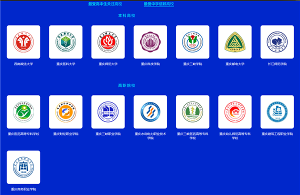 “2022年最受高中生关注高校”榜单,根据2022年度掌上高考全国高校招生数据库,高招智能问答系统、智能电话系统中来自各个省份高中生搜索、咨询和评论数据,对各指标进行不同权重的加权分析后,结合掌上高考高校口碑系统相关指标综合计算,最终评选得出的榜单。经过前期征集、专家会审、综合评审等阶段,重庆市共有15所高校脱颖而出,西南政法大学、重庆医科大学、重庆邮电大学、重庆师范大学、长江师范学院、重庆科技学院、重庆三峡学院、重庆医药高等专科学校、重庆三峡医药高等专科学校、重庆三峡职业学院、重庆财经职业学院、重庆水利电力职业技术学院、重庆幼儿师范高等专科学校、重庆商务职业学院、重庆建筑工程职业学院获得“2022年度最受中学信赖高校”荣誉称号。