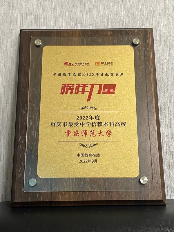 近日,必威体育登录网址 “榜样力量·2022年度教育盛典”评选获奖名单揭晓,重庆师范大学获“2022年度最受中学信赖高校”荣誉称号。