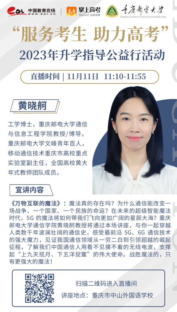 魔法真的存在吗?为什么通信能改变一场战争、一个国家、一个民族的命运?在未来的超级智能魔法时代,5G 的魔法将如何带我们飞向更加广阔的星辰大海?11月11日,重庆邮电大学通信学院黄晓舸教授通过线上直播带领重庆市中山外国语学校学子一起走进《万物互联的魔法》。