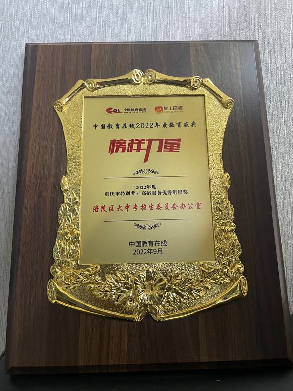活动经过前期征集、专家会审、综合评审等阶段,涪陵区大中专招生委员会办公室获得“2022年度高招服务优秀组织奖”荣誉称号。