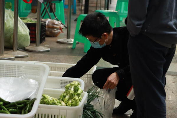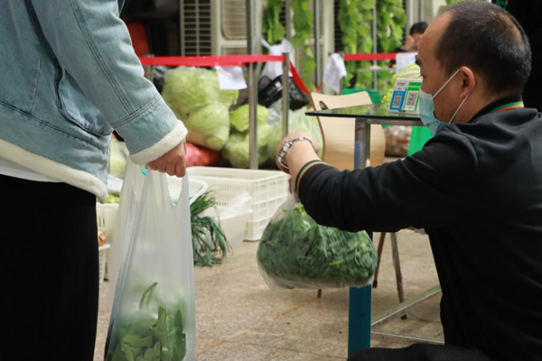 “叔,这里的菜比起外面的质量好不好?价格贵不贵呀?”问一位正在挑选蔬菜的大叔。“还行,不是太贵。”大叔大声回答“学校食堂每天都会有新鲜菜来,不仅方便我们老师的日常生活,并且也价格很合理,并没有因为封控就涨价。”