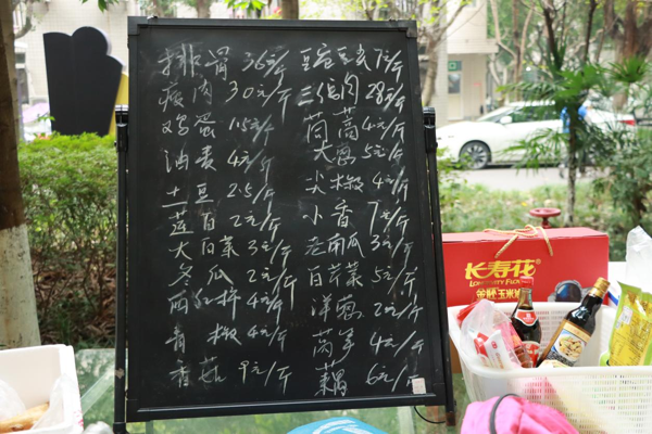 11月24日13点40分左右,在重庆对外经贸学院食堂东北角热闹非凡,一个专门为校内教职工家属准备的小菜市正在营业。地上并排摆放好些塑料菜篮子,盛放着包菜、花菜、西红柿、茄子、辣椒、冬瓜、萝卜等十余种蔬菜,猪肉、排骨、羊肉等荤菜,食用油、大米等,以及在服务员旁边桌子上还摆放少许酱油、味精、豆瓣酱等调味品瓶。给人感觉是,小菜市“麻雀虽小五脏俱全”,尽可能满足生活所需,散发出一种满满的、暖暖的人性关怀。