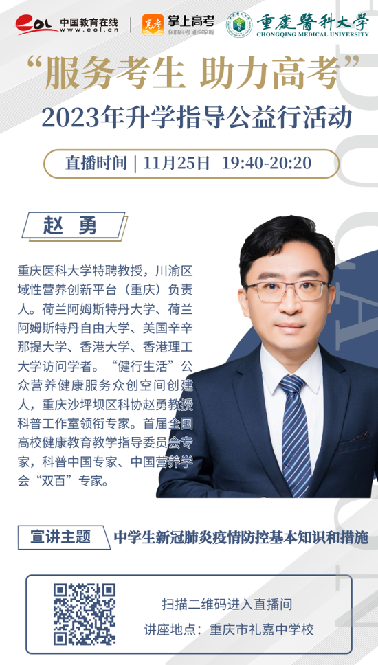 新冠肺炎的症状及与普通感冒的区别是什么?如何做好个人防护?11月25日,重庆医科大学公共卫生学院教授赵勇通过线上直播带领重庆市礼嘉中学校学子一起学习《中学生疫情防控基本知识和措施》。