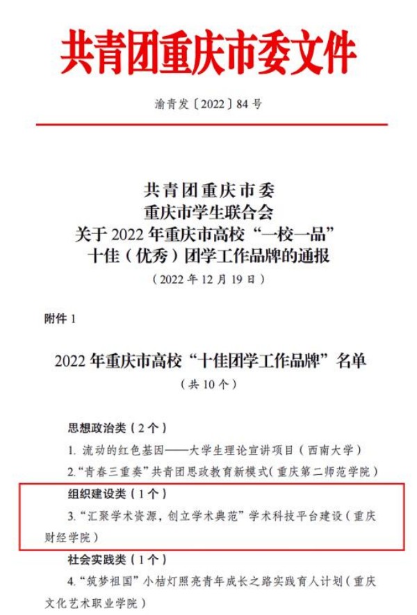 近日,由共青团重庆市委、重庆市学生联合会联合开展的2022年重庆市高校“一校一品”十佳(优秀)团学工作品牌评选结果揭晓,重庆财经学院学术科技类学生社团经济总协会“‘汇聚学术资源,创立学术典范’学术科技平台建设”项目成功获评为2022年重庆市高校“一校一品”十佳团学工作品牌。