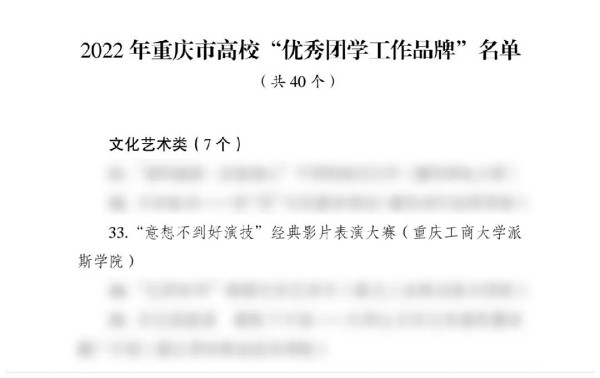 按照《重庆市高校“一校一品”优秀团学工作品牌培育建设管理办法(修订)》的相关规定,由机关、企事业单位、研究机构等领域专家组成的评审组对127个入围项目进行了终审,其中,重庆工商大学派斯学院“意想不到好演技”经典影片表演大赛入选2022年重庆市高校 “优秀团学工作品牌”文化艺术类。