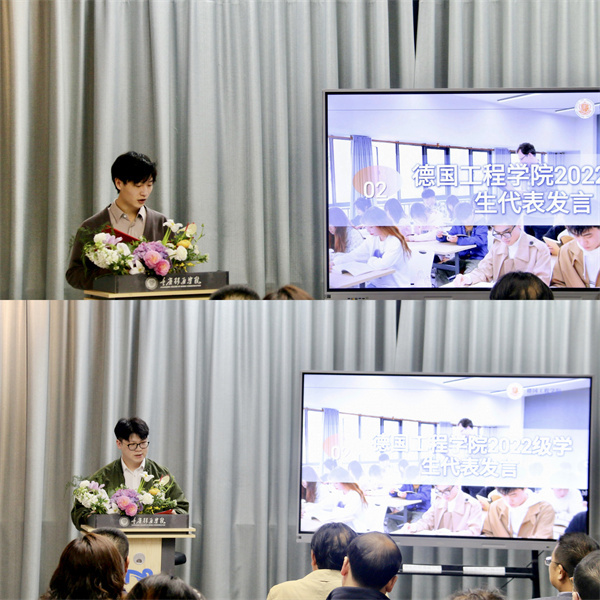 接下来,德国工程学院学生代表刁国峻同学讲到:如果没有学校提供的良好学习环境与老师们尽职尽责的付出;如果没有家人给予的经济与精神上的支持,我们不可能在这幸福地学习,更不可能有今天这样优越的条件和机会发展自己。周渝曦同学讲到:我们移通学院办学特色鲜明,人才培养模式独特,硕果累累。学校不断加快着超常规、高质量发展的步伐,为我们学业有成及今后的发展铺好了路,我们将不负韶华,努力从德工开始实现今生无悔的灿烂人生。
