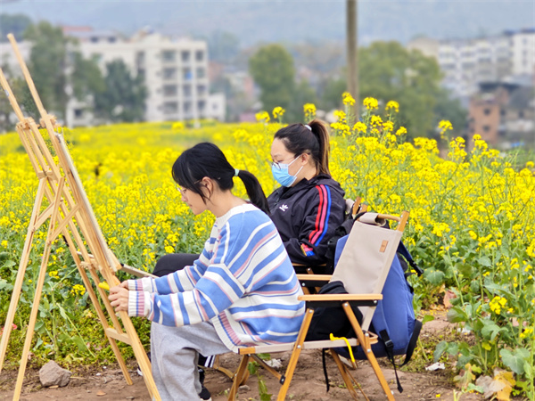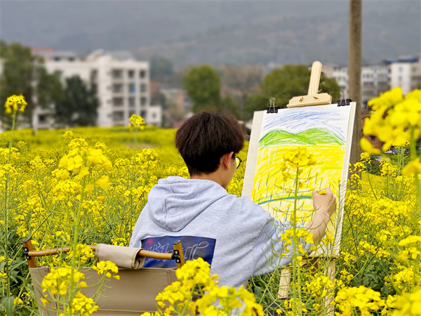 春阳映入花蕊,春风摇动着花枝,莺燕翩然起舞,蜜蜂流连花间,写生的同学们置身于花田中感受春风拂过、花浪翻滚,满山的油菜花随风摇摆,为写生的同学们的画作增添了一丝动态感。他们用手中的画笔,在纸上描绘着这片迷人的油菜花田,晴朗的蓝天与轻舞的花田在他们的画中连成一线,定格着这个生机勃勃的春天。