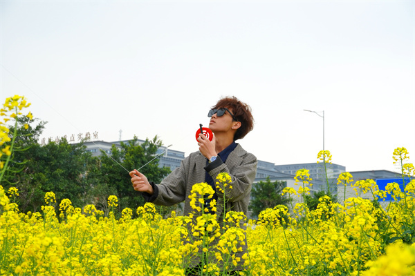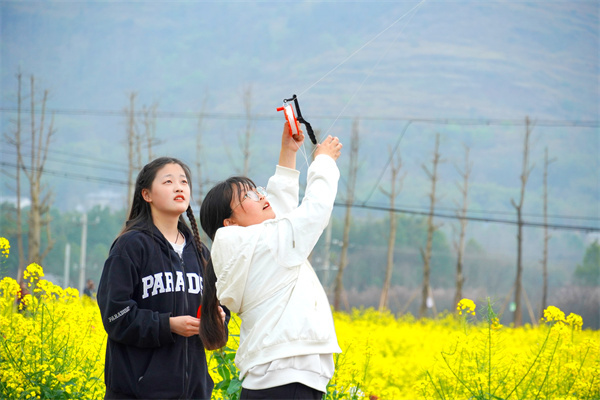 花田另一边,同学们右手举着风筝,左手拽着线,趁着风向有说有笑地奔跑着,他们时而回头看着盘旋打转的风筝,时而停下讨论和想象着放飞后的美景。不过半时,轻盈的风筝终于回到蓝天的怀抱,而同学们手拿着线轴,和周围的朋友一起,盯着它慢慢入神,与花田一起构成了一幅美丽而安静的画卷。