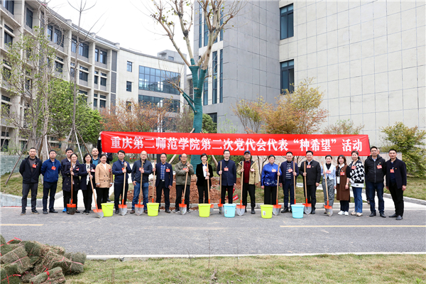 3月21日,正值二十四节气之春分,春回大地、万物复苏,重庆第二师范学院党委书记张艳、校长万书辉等校领导与第二次党代会第二代表团代表一起,在产教融合大楼举行党代表“种希望”植树活动。
