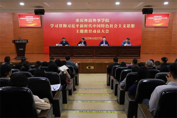 4月27日上午,重庆外语外事学院在渝北校区学术报告厅召开学习贯彻习近平新时代中国特色社会主义思想主题教育动员大会,深入学习贯彻习近平总书记在主题教育工作会议上的重要讲话精神,认真落实全市主题教育动员大会精神,安排部署学校主题教育工作。抓好主题教育意义重大,影响深远。会议强调,要更加紧密团结在以习近平同志为核心的党中央周围,在市教委的坚强领导下,在市教委巡回指导组的有力指导下,深入学习贯彻习近平新时代中国特色社会主义思想,以高度的政治自觉、务实的作风举措,圆满完成主题教育各项任务,以高质量主题教育努力为学校高质量发展作出新的更大贡献。