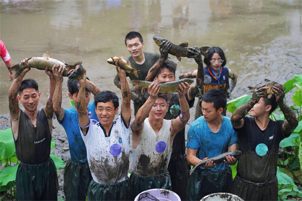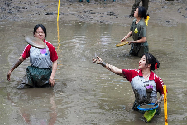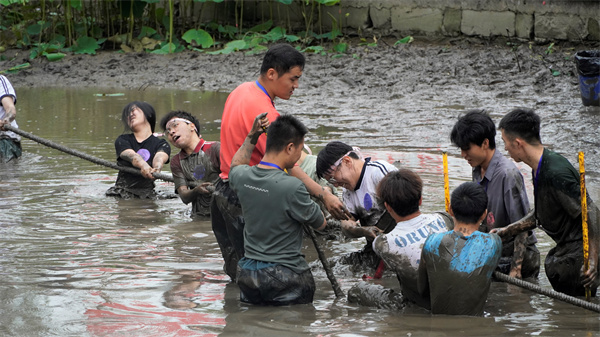 传承经典泥地项目,捕鱼大战一触即发。队伍将同时进入泥地,在规定时间内捕捉鱼儿。参赛者们早在岸边跃跃欲试,待裁判一声哨响,纷纷涌入泥地。参赛者们和鱼儿在泥地里互相博弈,他们无所畏惧,配合队伍拦截、围堵、进攻、抓捕,团队的默契配合和团结协作,让现场的氛围热闹欢腾,观众的喝彩声和欢笑声此起彼伏。参赛人员们通过本次泥地排雷环节,团魂已有熊熊燃烧之势,是不畏艰辛的勇气,是不言放弃的坚定,也是绝不抛弃的互助与团结。