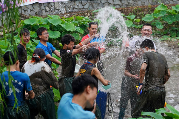 各队伍获得不同的泼水工具与防水工具,他们在泥地上泼水狂欢,共同分享喜悦,好似彼此冲刷掉挑战赛带来的疲惫。在泼水游戏过程中,参赛人员在草坪里寻找装有特殊卡片的信封,从而可得到泼水防水工具获取或者没收的特权,这让泼水游戏增添了几番趣味,整个泥地都热闹不已,参赛人员们玩得不亦乐乎。移通学子在活动中体验到了“泼水节”的别致趣味,大学生活的独特乐趣,他们挥洒着青春活力的汗水,洋溢着幸福快乐的笑容,也体悟到,乾坤未定,结局仍可翻转的定律。