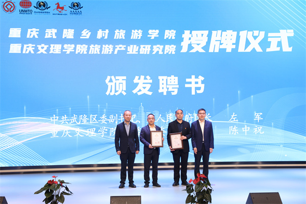 武隆区人民政府副区长刘印、学校党政办主任黎志为“重庆武隆乡村旅游学院”“重庆文理学院旅游产业研究院”授牌。武隆区人民政府区长左军、学校副校长陈中祝分别为学校旅游学院及武隆区职教中心负责人颁发执行院长聘书。