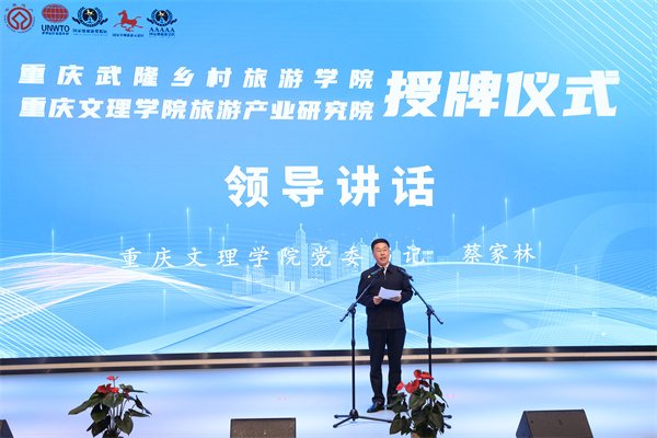 学校党委书记蔡家林在致辞中指出,发展乡村旅游产业适逢其时。今年中央一号文件明确提出,加快发展现代乡村服务业,实施乡村休闲旅游精品工程,培育乡村新产业新业态,发展乡村旅游产业是积极落实国家战略的重要举措。兴办乡村旅游学院正逢其时。培育乡村旅游产业,必须人才先行;培育乡村旅游人才,必须办学先行。校地共建乡村旅游学院,既是服务国家乡村振兴战略的一大创举,也是支撑全市乡村旅游发展的一大探索,更是加快武隆乡村旅游人才培养的一大抓手。组建旅游产业研究院恰逢其需。武隆正着力打造康养等系列产业链,着力促进“工业+旅游”、“建筑业+旅游”、“服务业+旅游”、“农业+旅游”相互融合,这为深度开展旅游产业研究提供了丰富样本、搭建了广阔舞台、提出了迫切需求。