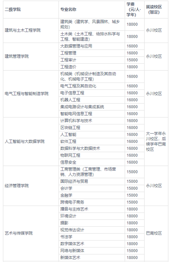 根据国家有关规定,新生进校后必须每学年按时向学校交纳学费和住宿费,收费标准严格按照重庆市价格主管部门相关文件执行,其收费标准如下(具体以重庆市价格主管部门核定为准):