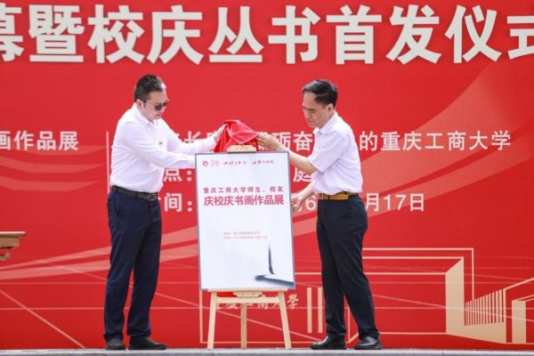 活动现场,李志雄和温涛共同为重庆工商大学建校70周年办学成果展和重庆工商大学师生、校友校庆书画作品展揭幕。