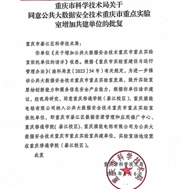 6月6日,重庆市科学技术局下发的《重庆市科学技术局关于同意公共大数据安全技术重庆市重点实验室增加共建单位的批复》文件中,同意重庆移通学院綦江校区、重庆旗能电铝有限公司纳入公共大数据安全技术重庆市重点实验室依托单位,即重庆市綦江区数据资源管理和应用推广中心、重庆移通学院(綦江校区)、重庆旗能电铝有限公司为公共大数据安全技术重庆市重点实验室共建单位,实验室场地设置在重庆移通学院綦江校区。重庆移通学院公共大数据安全技术重庆市重点实验室成为全国首家政校企共建省部级重点实验室。