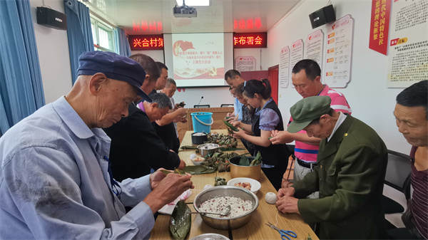 一岁一端午,粽叶又飘香。在端午节即将到来之际,为践行习近平新时代中国特色社会主义思想,深入挖掘端午深厚文化内涵,引导本部党支部全体党员干部增强文化自信,进一步弘扬中华优秀传统文化。6月20日上午,乌杨街道兴合村创新主题党日活动形式,组织支部党员开展“党建引领促振兴,端午“棕”情聚人心”过中国节·端午主题党日活动,村两委和驻村工作队全体人员以及在家的党员同志参加了此次活动。