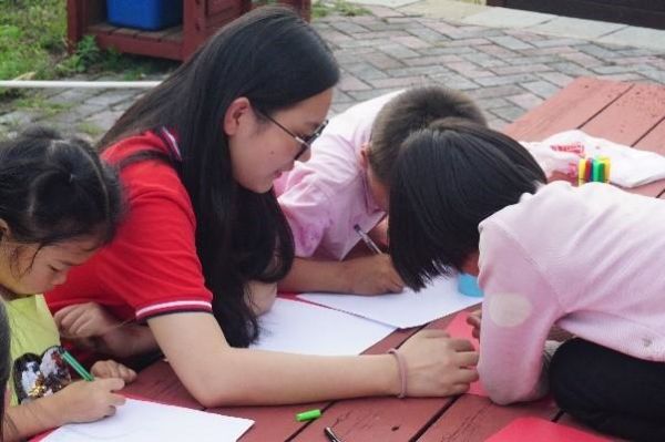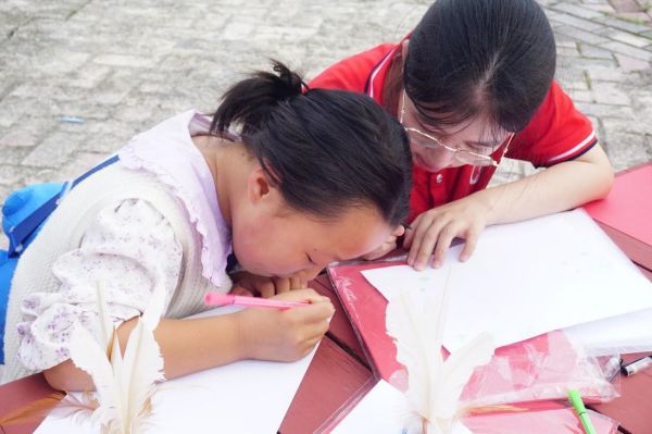 子璇为孩子们讲解了基本的绘画知识,例如如何勾勒出绘画作品的轮廓和如何选择颜色搭配等,鼓励小朋友们积极动手创作。在她的细心讲解下,现场的小朋友们有模有样地纷纷投入到“创作”中,通过各种线条、颜色来表达他们所看到的、感觉到的、想到的……在绘画过程中,观察团成员时刻关注着孩子的绘画作品,并且在他们产生疑惑的时候进行答疑;不一会儿,各种各样的绘画作品从小朋友们的手中创作出来,他们纷纷举起自己的“作品”,脸上是满满的自豪。通过本次活动,小朋友们在体验动手动脑的乐趣的同时,也激发了绘画创作的灵感与热情,体会了到艺术创造带来的乐趣。最后,观察团成员带领小朋友们在村民文化广场上折纸,教小朋友们打篮球、跳舞,这不仅丰富了他们的暑期生活,也在寓教于乐中拓宽了他们的视野。