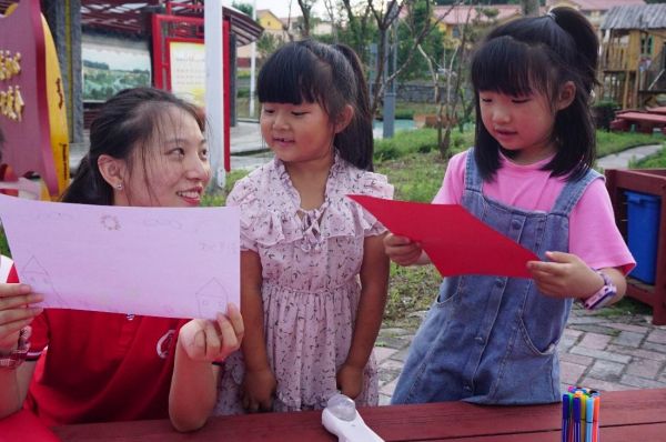 (观察团成员带领小朋友绘制“美丽塘约”明信片)