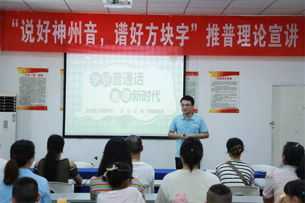 在此基础上,宣讲团邀请专业教师面向社区居民进行理论宣讲,为北渡社区的居民厚植“学好普通话,奋进新时代”的情怀。“普通话是以北京语音为标准音......”重庆第二师范学院教师教育学院汉语言专业教师廖绪崊以“博士”和“不是”引发的误会为切入点,围绕什么是普通话和规范字、为何要推广普通话给北渡社区的居民开展了一堂普通话的理论宣讲,号召大家从自身做起,带动身边的人一起共建语言文明城市,用一言一行贯彻推普助力乡村振兴号召。