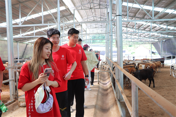 杨金典书记向队员们介绍道,因金线村资源禀赋优势不明显,因地制宜开展符合本村实际的肉牛、家禽养殖产业,是金线村当前对产业可持续发展的主要探索。队员们现场了解到金线村经济联合社采用先进的发酵床技术,在产出富含高蛋白优质牛肉的同时获得大量有机肥料,将牛粪经过无害化处理后还田还土,促进了生态农业的良性发展。现代先进科技用于养殖业发展,不仅提高了生产效率,还带动乡村经济与生态文明的密切结合,生动地诠释了农村绿色产业建设的发展之路,为乡村振兴战略的实践起到了示范作用。队员黎莹说:牛群三三两两在干净整洁的牛场中徜徉,看到有客人来,纷纷凑上前来“打招呼”,才出生三周的小牛尤为可爱,没有传统牛场的臭味,这也是生态养殖业的成功所在。