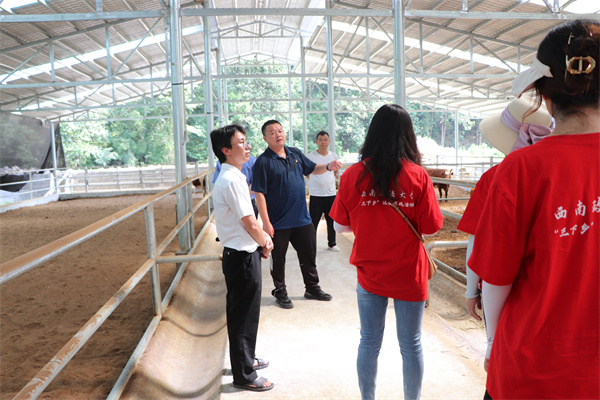大溪镇金线村位于国家乡村振兴重点帮扶县之一的重庆市酉阳土家族苗族自治县。市国资委派驻大溪镇金线村驻村第一书记、西南政法大学校友杨金典,大溪镇党委政府领导以及金线村干部群众陪同三下乡志愿服务队参观了金线村肉牛养殖基地。整洁的牛舍,活跃的牛犊,昭示着村民们致富的希望,也代表着乡村产业振兴的真正实践。