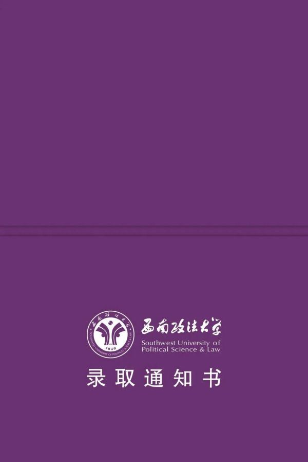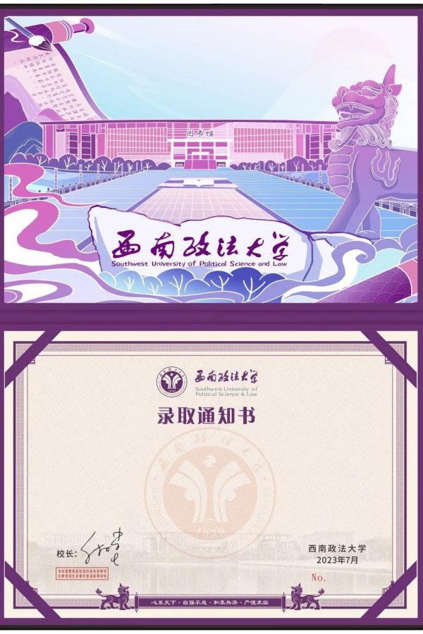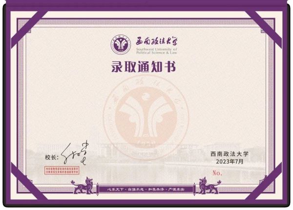 收到来自西政的录取通知书,我很荣幸。这份录取通知书承载着期望、鼓舞和鞭策,我将秉持“博学、笃行、厚德、重法”的校训自强不息、勤学苦练。