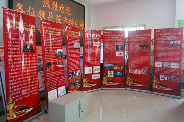 在村委会的协助下,实践团成员在村委会办事大厅举办习近平经济思想学习宣传展,以丰富的图片、数据、案例,展示了习近平新时代中国特色社会主义思想指导我国经济改革和发展实践、引领党和国家事业发展取得的历史性成就,深刻诠释了习近平经济思想的重大历史意义、现实意义和时代意义。