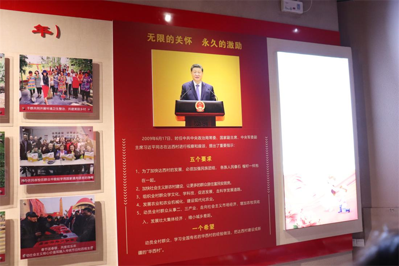 图为实践团成员认真听取解说员讲解达西村的发展史。