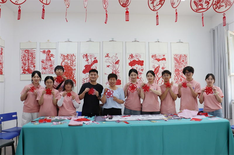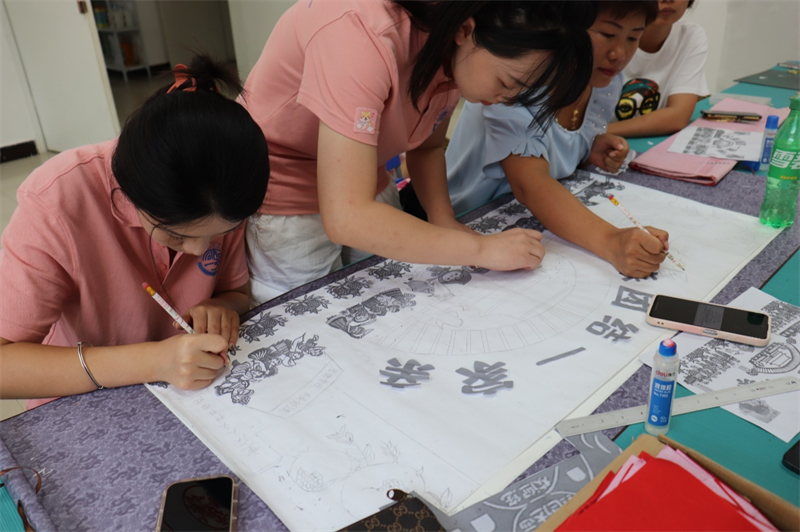 图为实践团成员和剪纸传承人汤丽老师共同绘制剪纸底稿