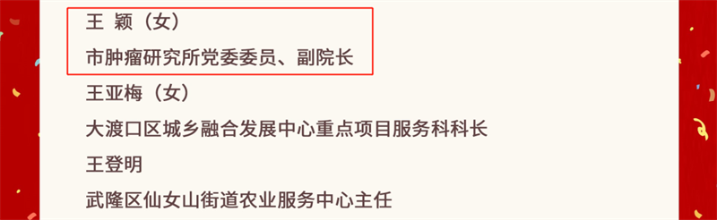 为表彰先进、弘扬正气,进一步激励引导全市广大干部牢记习近平总书记殷殷嘱托,踔厉奋发,勇毅前行,8月7日,重庆市委组织部、市人力社保局、市国资委日前联合印发《关于表彰2022年度“重庆市担当作为好干部”的决定》,表彰100名同志为2022年度“重庆市担当作为好干部”。重庆大学附属肿瘤医院、重庆市肿瘤研究所党委委员、副院长王颖获此殊荣。点赞!重大人获评“重庆市担当作为好干部”!