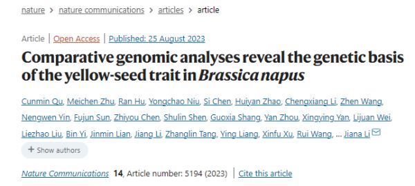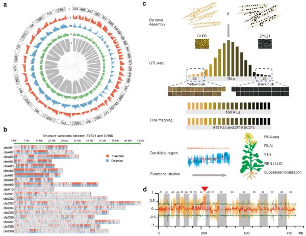 2023年8月25日,西南大学油菜分子生物学研究团队李加纳教授/曲存民教授在Nature Communications发表了题为Comparative genomic analyses reveal the genetic basis of the yellow-seed trait in Brassica napus的研究论文,该研究通过甘蓝型油菜黄籽GH06和黑籽中油821高质量基因组的组装,围绕控制种皮色泽主效QTL区间,成功克隆了一个控制油菜种皮色泽重要基因,并解析了其参与调控种皮色泽形成和类黄酮代谢的分子机制,为油菜品质性状改良提供了新的分子策略。