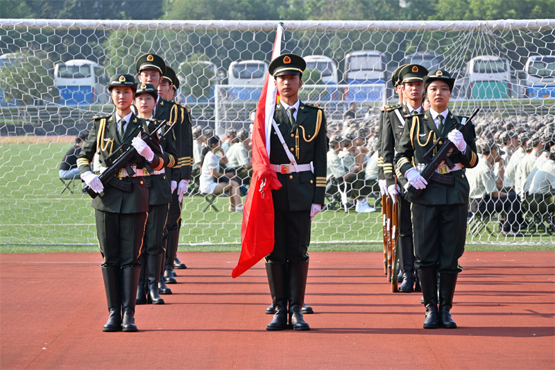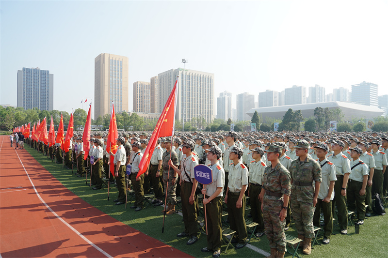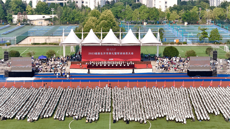9月3日上午,重庆大学2023级新生开学典礼暨军训动员大会在虎溪校区体育场举行,6400余名新生身着军训服端坐操场中。重庆大学校长、中国工程院院士王树新为新生带来“开学第一课”——启兹重大,奋楫争先!