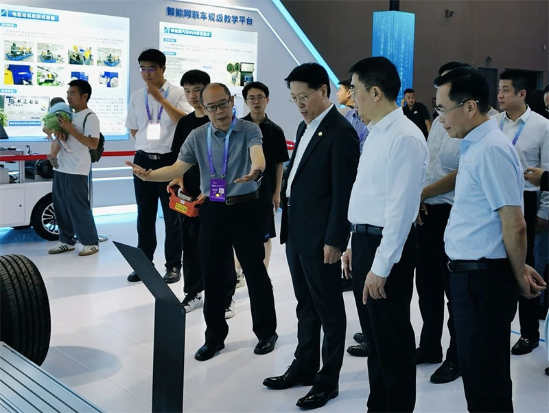9月4日,2023中国国际智能产业博览会(以下简称“2023智博会”)在重庆国际博览中心开幕。重庆理工大学作为区域合作展区的高校代表,重点聚焦“智能网联新能源汽车”主旨,通过大屏、沙盘、实体装备等全方位展示了学校多项科技成果。